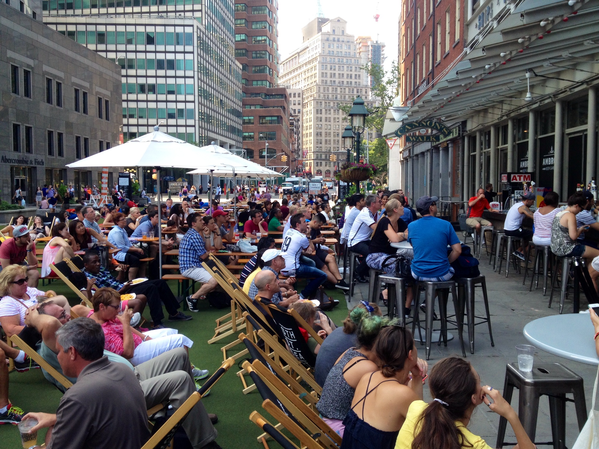South Street Seaport could have been an awesome place to watch the game if they had set up a suitable screen. A mild breeze blew off the water and the buildings around the Astroturf community space provided shade. Quiet families and couples sat at long tables and strained their eyes to watch the match on the dinky TVs. Kids lounged in beanbag chairs along the perimeter of the picnic area. A pasty British family chuckled next to me, while a pack of disinterested German-speaking twenty-somethings arrived right after Muller’s goal.