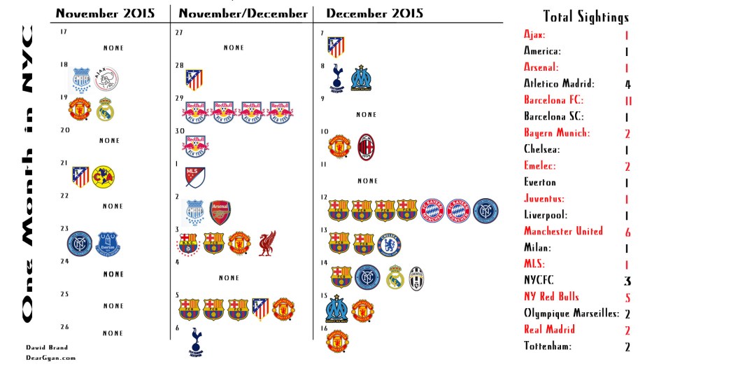Back in early-November, I charted every piece of MLS and English Premier League apparel I saw over four days at three Disney amusement parks in Florida. It was a fun way to pass the time so I decided to expand my field research to New York City.