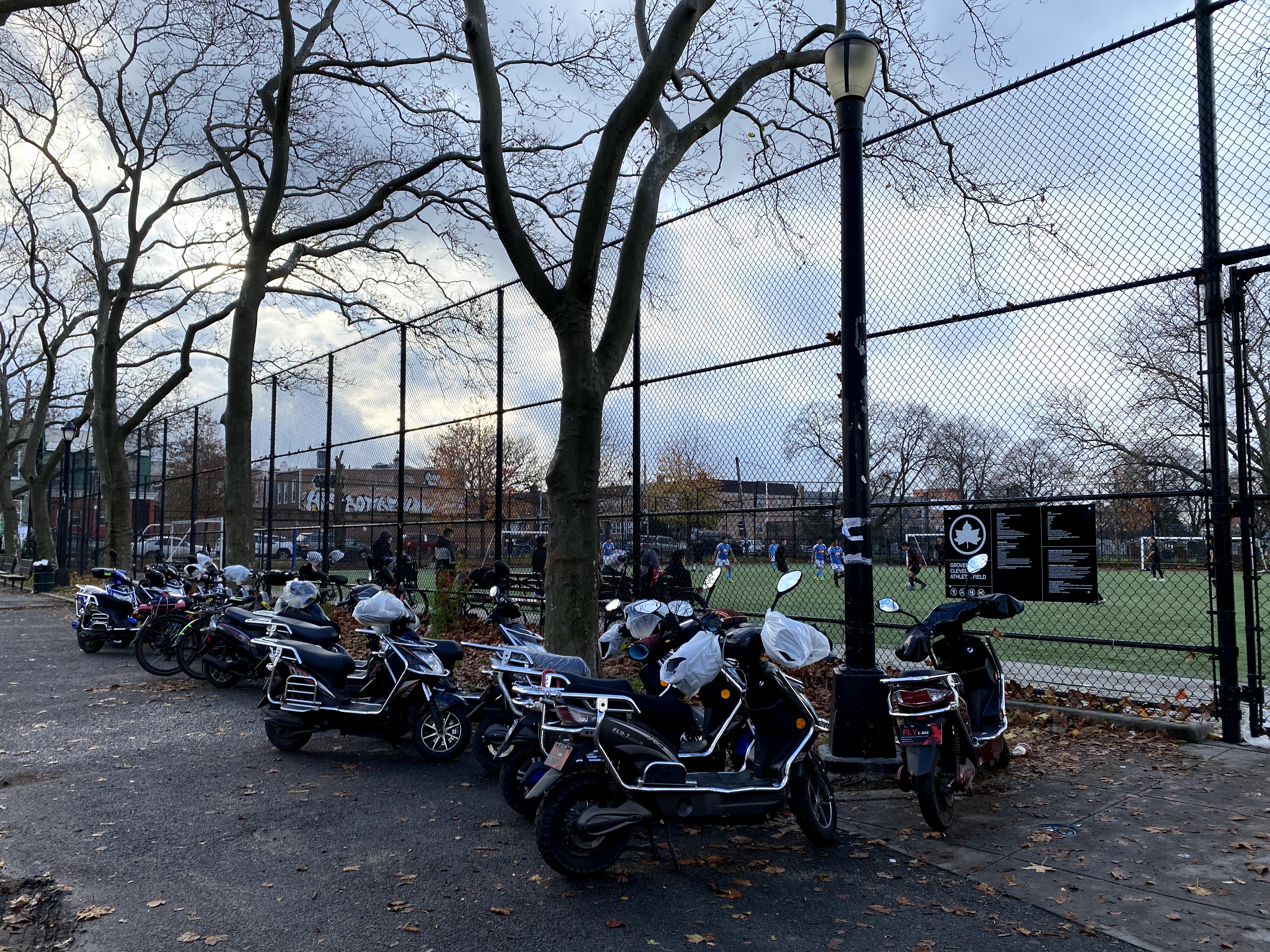The deliveristas park their scooters at fields across NYC and kick it around during their off hours, before the afternoon or evening rush. Then they hop back on the bikes and deliver lunch and dinner to millions of New Yorkers.